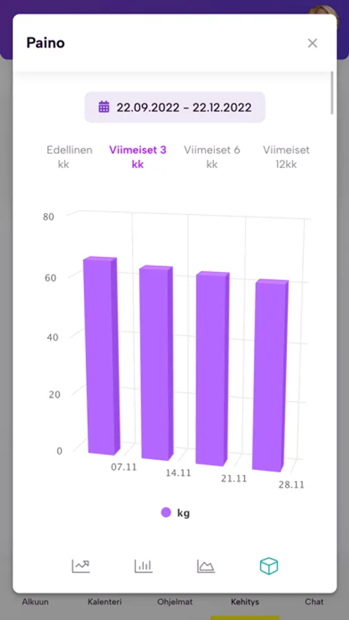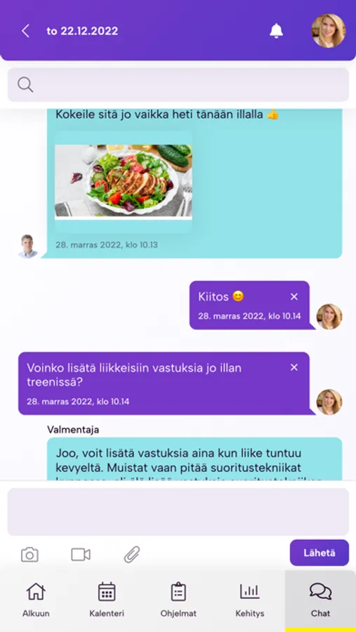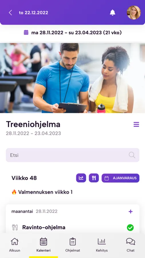 Treeniohjelmat, ravinto-ohjelmat ja kehityksen seuranta.
