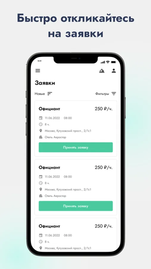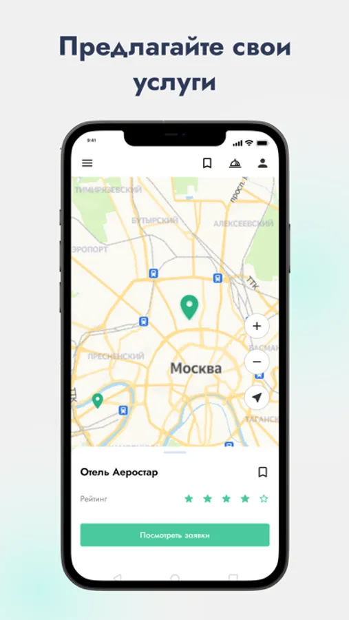 • Быстрая регистрация, интуитивный интерфейс, поиск отеля или ресторана на карте делает выбор заявок быстрым и удобным.