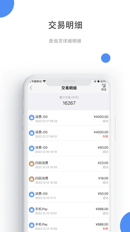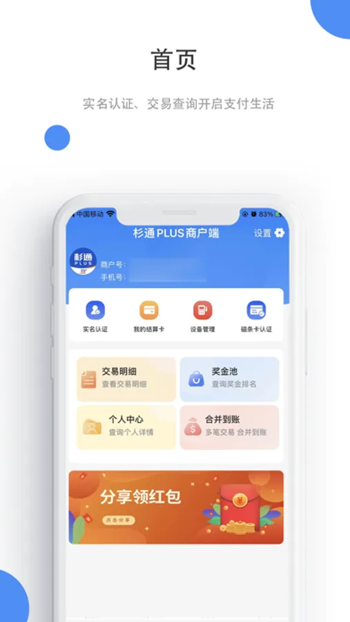 杉通PLUS商户端是一款专为中小微商户资金收付的管理工具。商户可在APP上自主进件,绑定结算卡、信息更新等,为商户提供安全的认证方式,让商户随时随地了解交易详情。