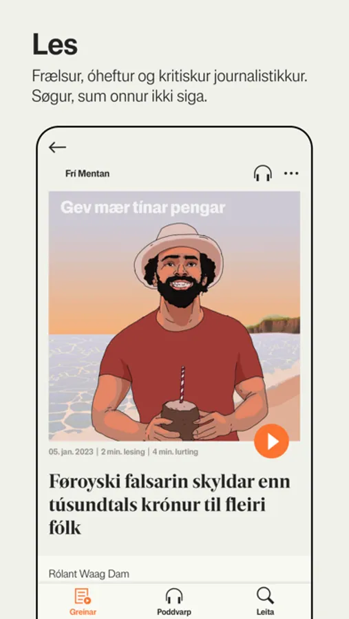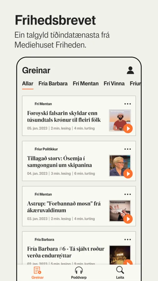 Í appini hjá Frihedsbrevet fært tú sama óhefta og kritiska journalistikk, sum tú hevur sæð á okkara heimasíðu og í okkara tíðindabrøvum. Her fært tú eitt greitt yvirlit yvir alt - bæði á skrift og sum ljóð.