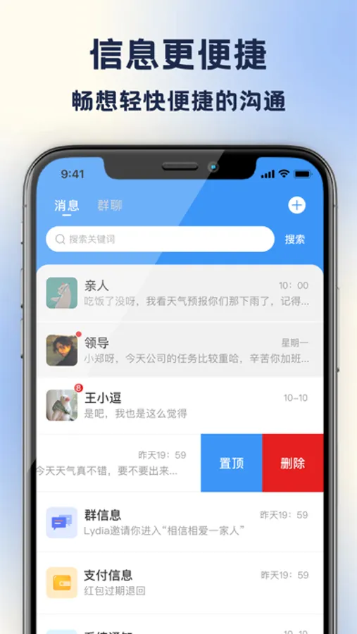 倾讯支持单聊,群聊;同时支持图片,文字,动图等信息传输,从而也对传输进行安全加密,让用户产敞心所谈。