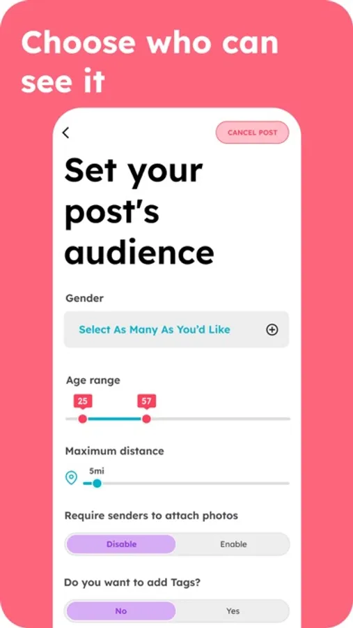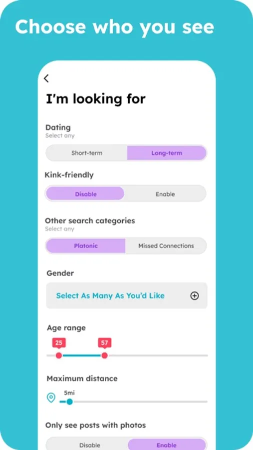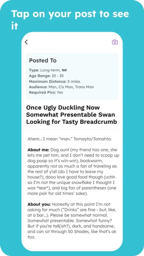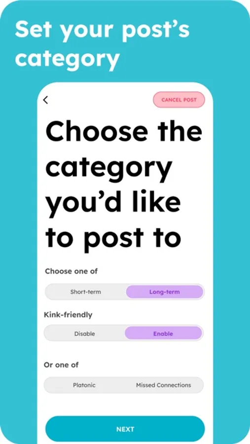 - Interests: We understand that people can have more than one way to express themselves. That's why we allow 3 active posts at a time, and offer 6 relationship categories to choose from