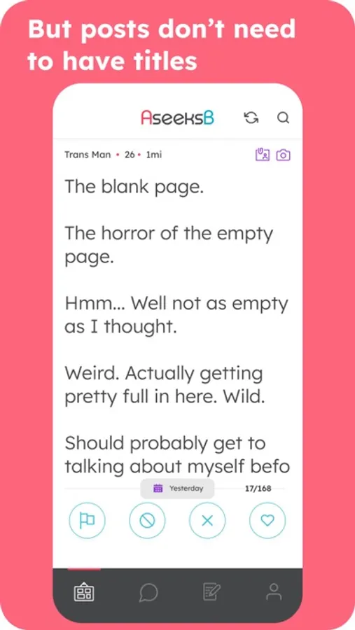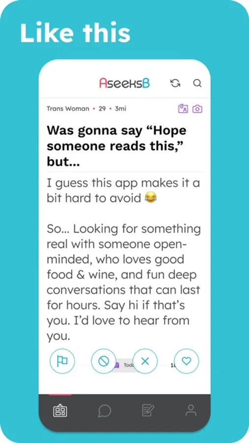 AseeksB is a free personal ads app where you can post and search for whatever kind of relationship you’re looking for. From long-term to short-term. From platonic relationships to missed connections too.