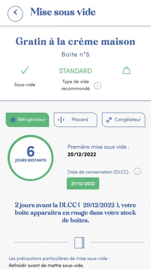 • Vous prévient lorsque votre aliment ou plat sous-vide doit être consommé.