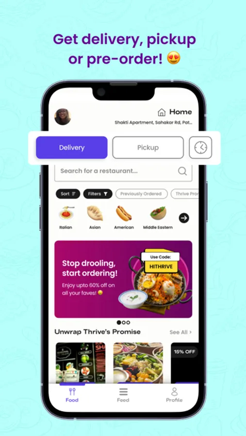 Avail special deals and order from restaurants exclusively delivering only via Thrive.