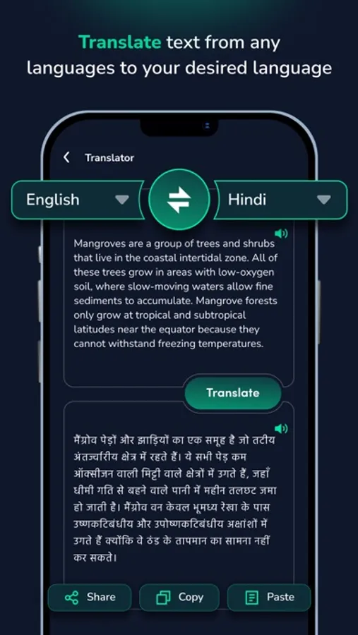 Break down language barriers with our integrated translator. Easily translate text into a variety of languages. Share or copy your translations for seamless communication and global connectivity.