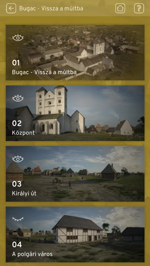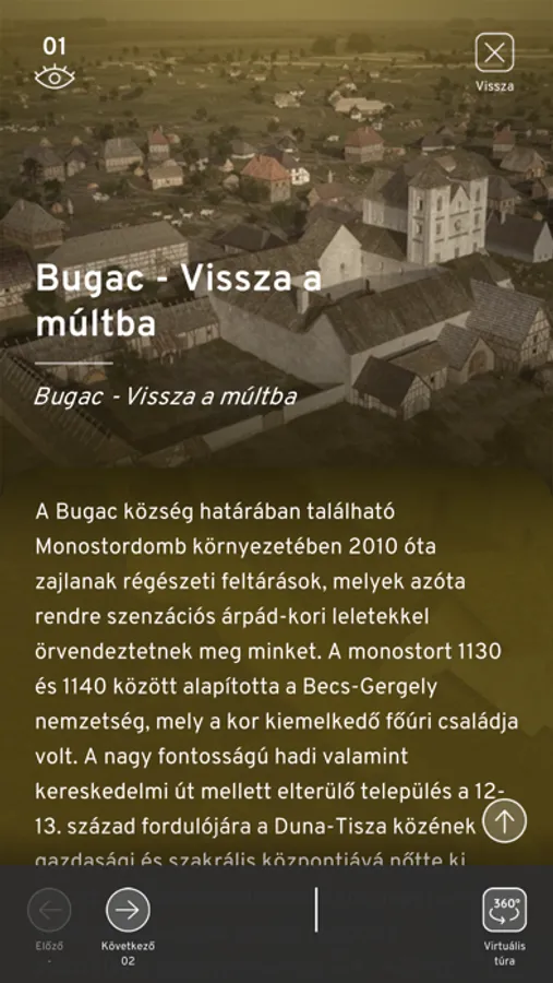 A Vissza a Múltba™ alkalmazás lehetővé teszi számunkra, hogy különböző helyszínek kiválasztható nézőpontjaiból körül nézzünk készülékünk segítségével a virtuális térben, amely az adott helyszín egyes történelmi korszakait rekonstruálja. Jelen alkalmazás a bugaci Aranymonostort mutatja be, illetve a 12-13. századi településképet.