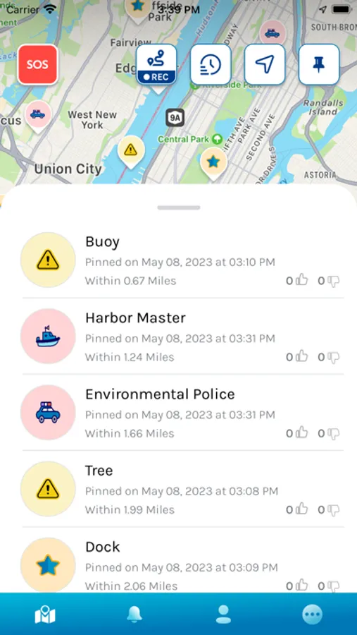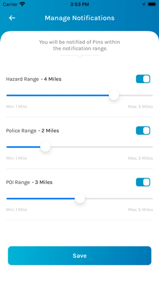 Pin the location of Hazards, Police and Points of Interest (POI) on the map to notify other users when they come within the notification range of such pins.