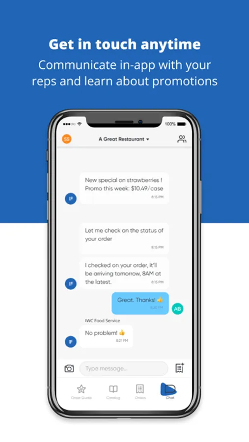 - Get in touch anytime: communicate directly with your IWC Food Service rep in the app