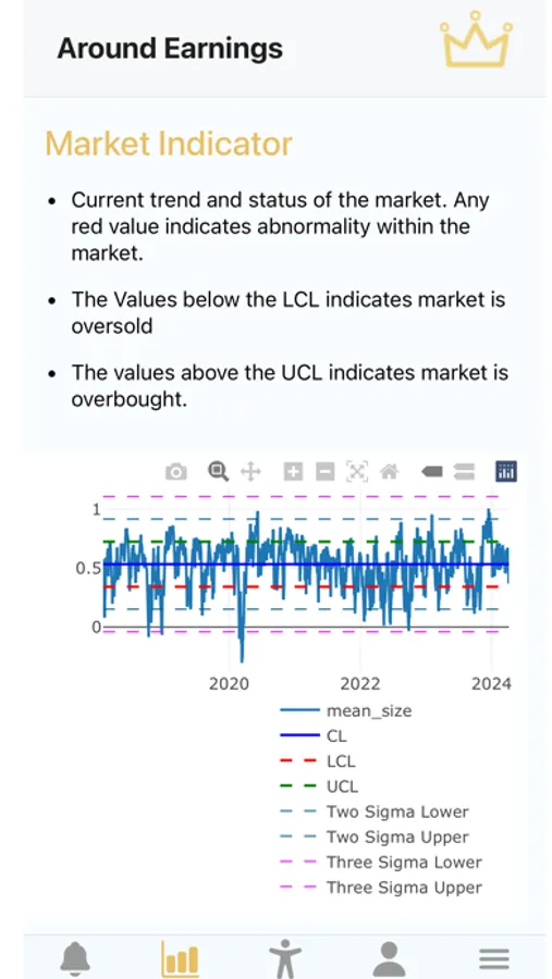 On the Market Indicator page of our app, you'll find a valuable tool that provides insights into the current trend and status of the market. The Market Indicator tracks the behavior of 500 stocks, and values below the Lower Control Limit (LCL) indicate that the market is oversold, while values above the Upper Control Limit (UCL) indicate that the market is overbought.