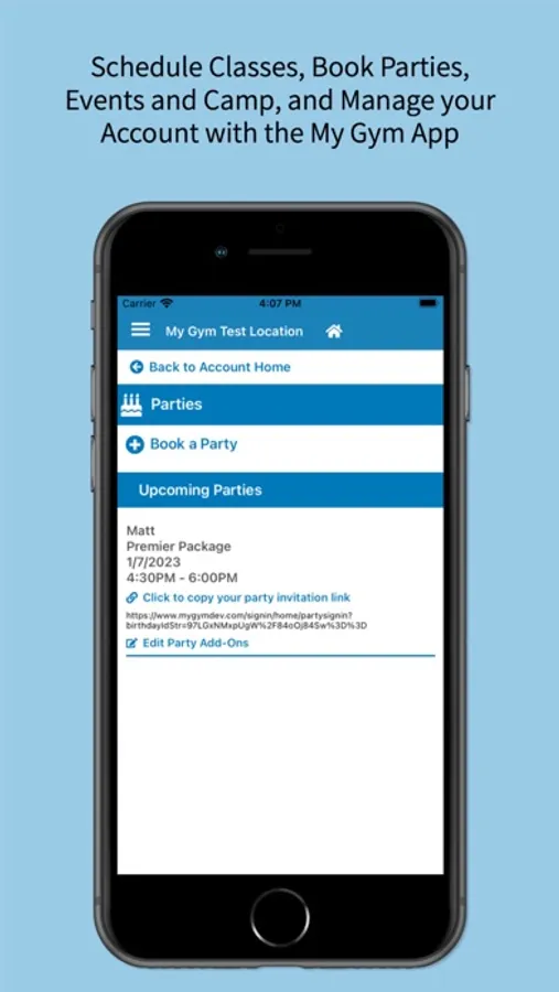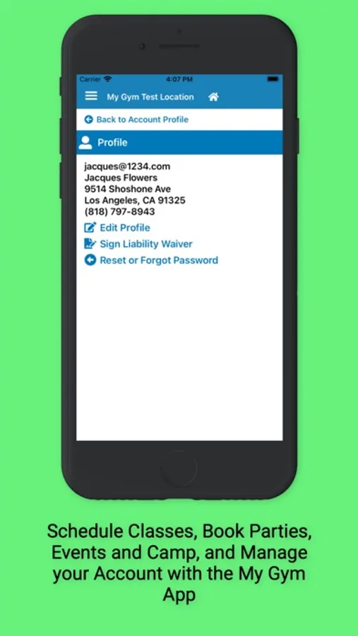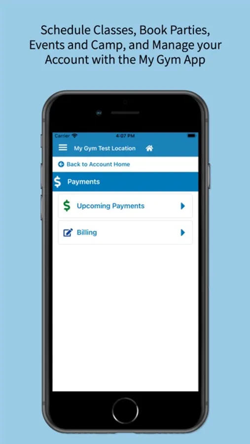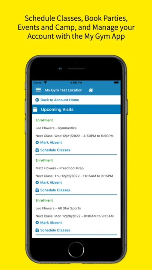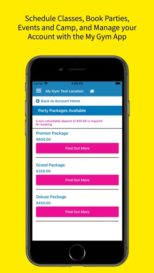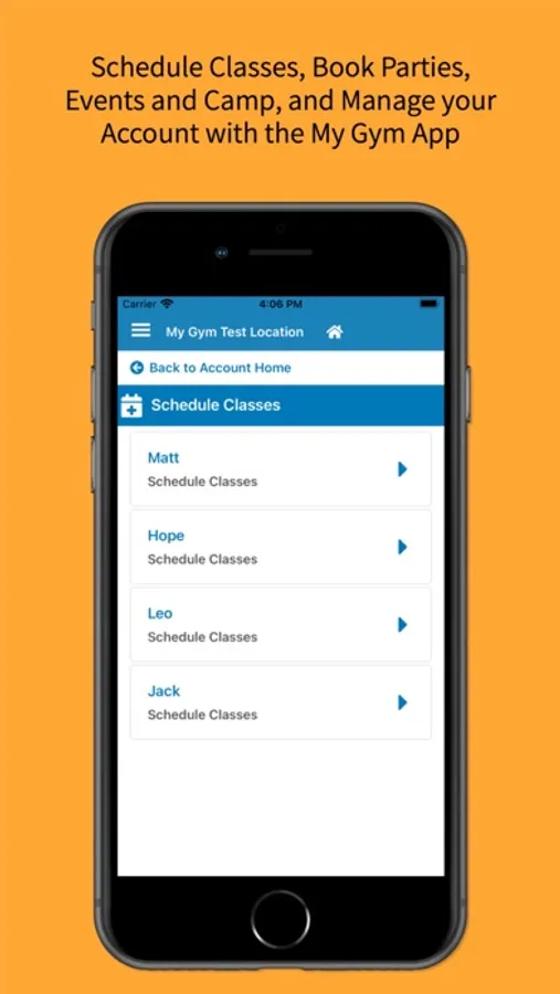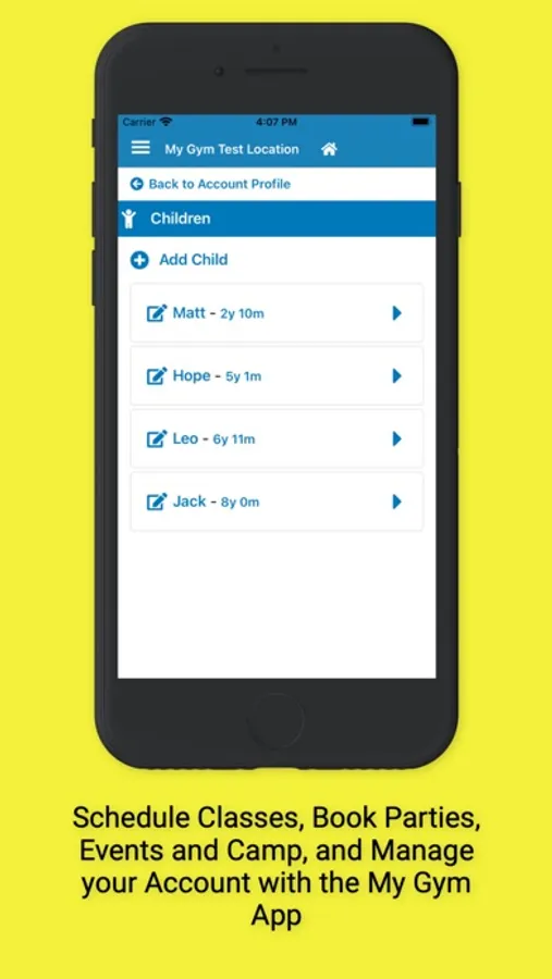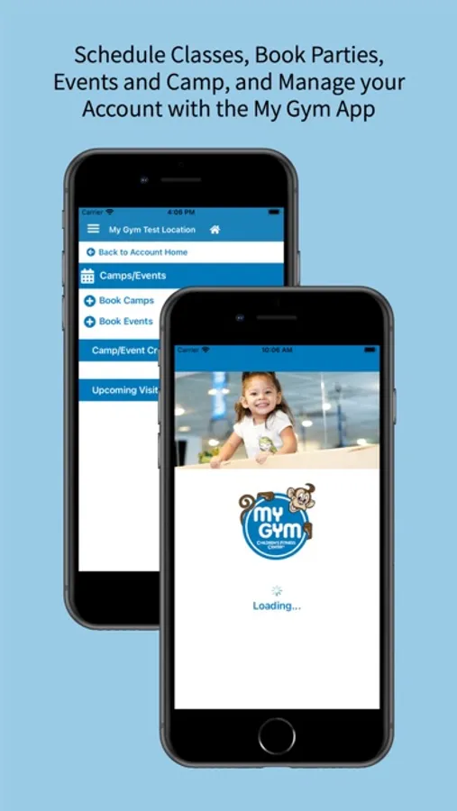 My Gym App allows parents to schedule and enroll in classes, book camps and events, book birthday parties and manage all of their account details