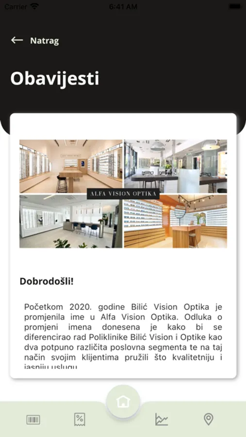 Alfa Vision Optika postala je sinonim za optiku s najzanimljivijom ponudom naočala, pritom zadržavajući ključ uspjeha Bilić Visiona – individualan pristup i kvalitetu usluge. Beskompromisnost u kvaliteti usluge ključan je faktor našeg uspjeha, a kada kompanija svakim danom “diše” ovakvu filozofiju, stagnaciji nema mjesta.