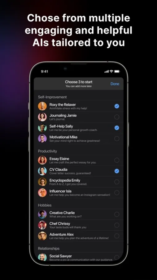 Chat with over 40 different AI-generated characters, ranging from self-improvement and productivity to hobbies, relationships, and historical figures. All brought to life by GPT-4 and ChatGPT technology!