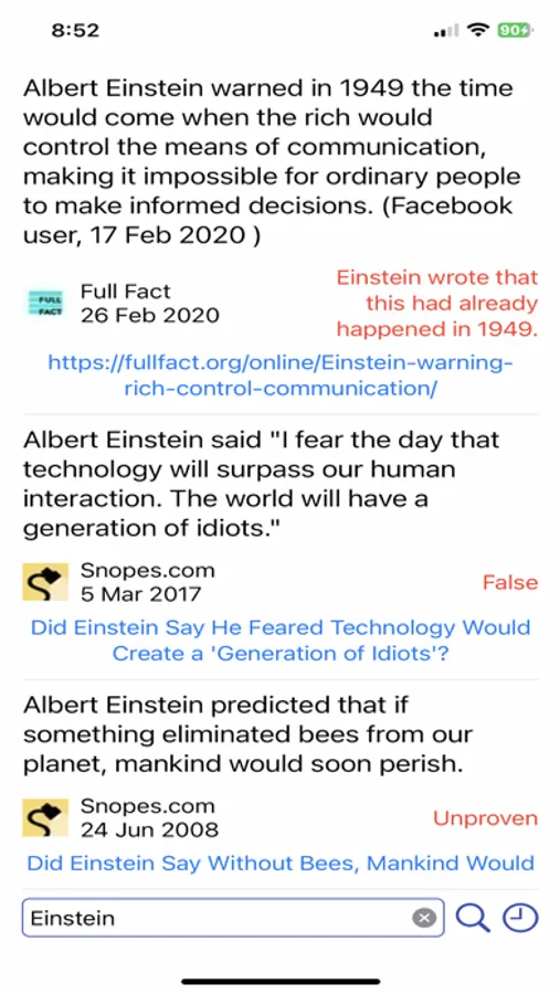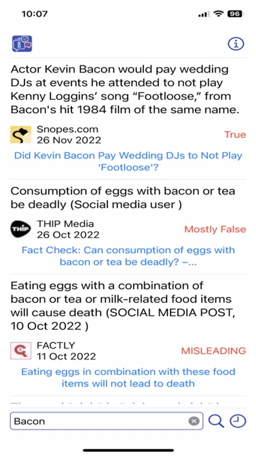 With a single search, SnappyFact brings you fact checks from an array of websites. Tap a result's web link to bring up the full article in your browser, and share from there. SnappyFact notifies you when new fact checks are posted for your searches. Launch with Siri - Just say: "Hey Siri, Check SnappyFact"!