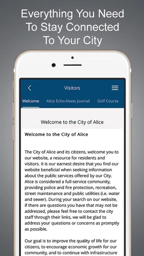 Become a civic resident and engage with your city like never before by downloading the official app. With features like Government, Services, Visitors, Community, Calendar and News you'll find it easier than ever to stay connected with City of Alice, TX with just a few taps on your mobile device.