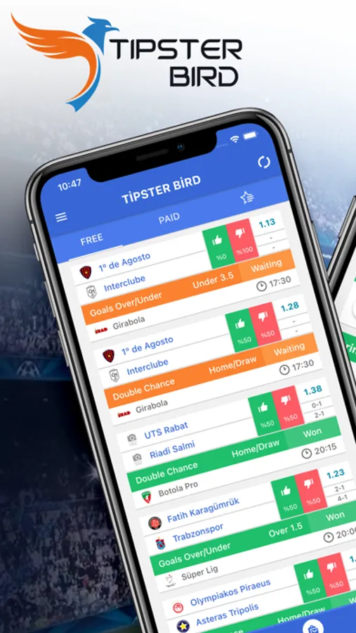Are you tired of losing bets on sports? Tipster Bird is here to solve all your problems. Our free mobile app uses cutting-edge algorithms to analyze team performance and player statistics, resulting in highly accurate predictions for various sports leagues. And the best part? It's absolutely free to download! So what are you waiting for? Give Tipster Bird a try and start winning today. Trust us, you won't regret it. Happy betting!