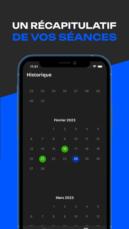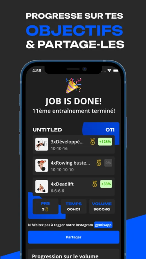 - Un suivi de votre progression, avec des graphiques et des statistiques qui vous permettent de suivre vos progrès et de voir où vous en êtes. Vous pouvez également enregistrer vos séances d'entraînement et constater votre progression à chaque entrainement.