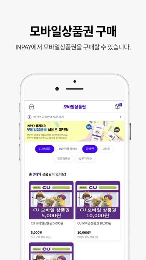 - 모바일상품권 구매 : 모바일상품권 금액권 및 교환권을 구매할 수 있는 기능