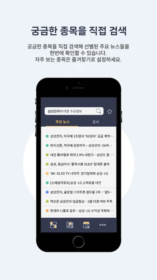 · 관심있는 종목, 궁금한 종목을 검색하면 인공지능이 선별한 주요 뉴스들과 주요 공시사항을 한눈에 볼 수 있습니다.