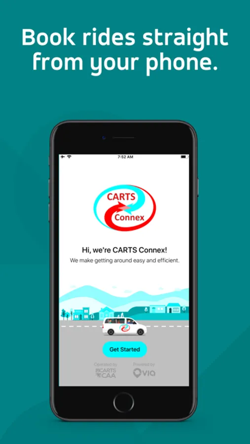 With the CARTS Connex app, you will be able to select your pickup location, tell us where you want to go, select your ride, and track it in real-time. When your ride is near, you will receive a text notification that your ride has arrived. Book rides for yourself or small groups of up to three people. All rides must start and finish within the service zone.