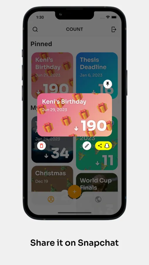 But Count is more than just a personal days counter - it's also a social app that allows you to connect with others and share your events and milestones. With Count, you can follow counts created by other people and see what events are important to them. You can even pin counts to your home screen or share them on Snapchat as stickers, giving you even more ways to stay connected with the people and events that matter most to you.