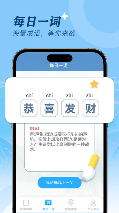 我来猜成语是一款学成语、成语答题的益智软件,规则简单:理解成语图片,选词填字回答正确的成语,来测试你的词汇量吧!