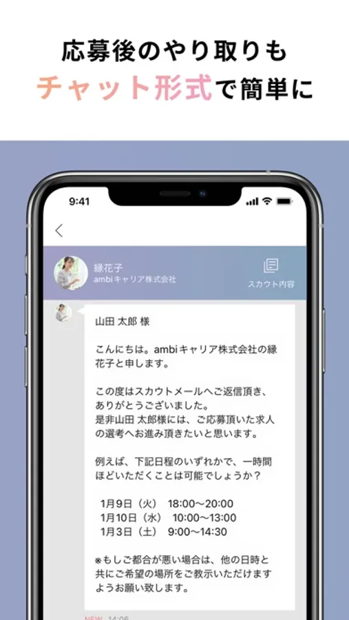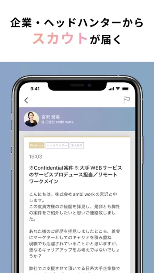 匿名状態の職務経歴書をみた企業・ヘッドハンターがあなたにオファー。スカウトを通じて、今のあなたの市場価値を知ることもできます。