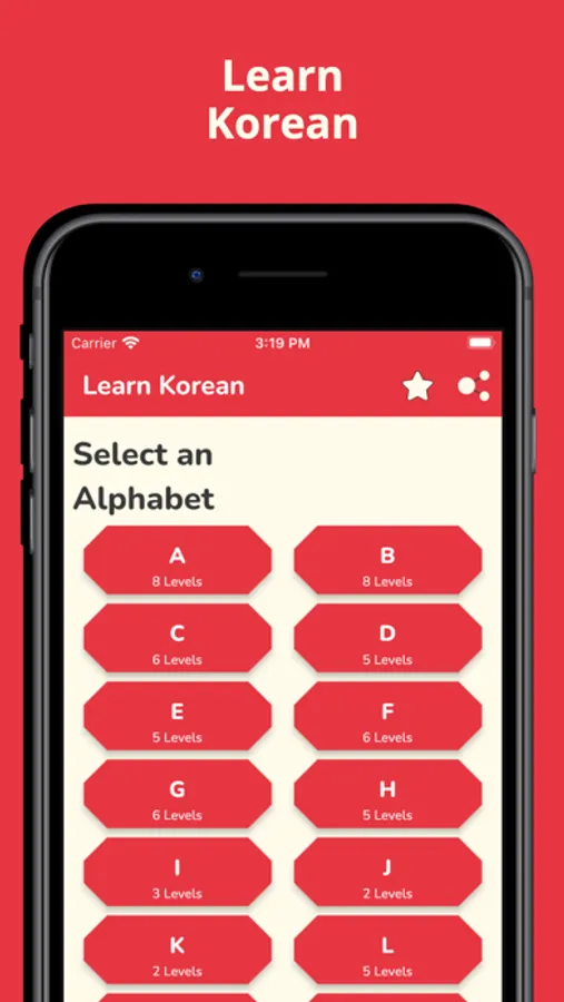 Learn Korean Language from basics to advance level by learning different useful words and phrases. This app provides you to learn korean alphabetically from beginner level. You can select any desired alphabet from the list and every alphabet have different levels which contains different essential korean words to learn.