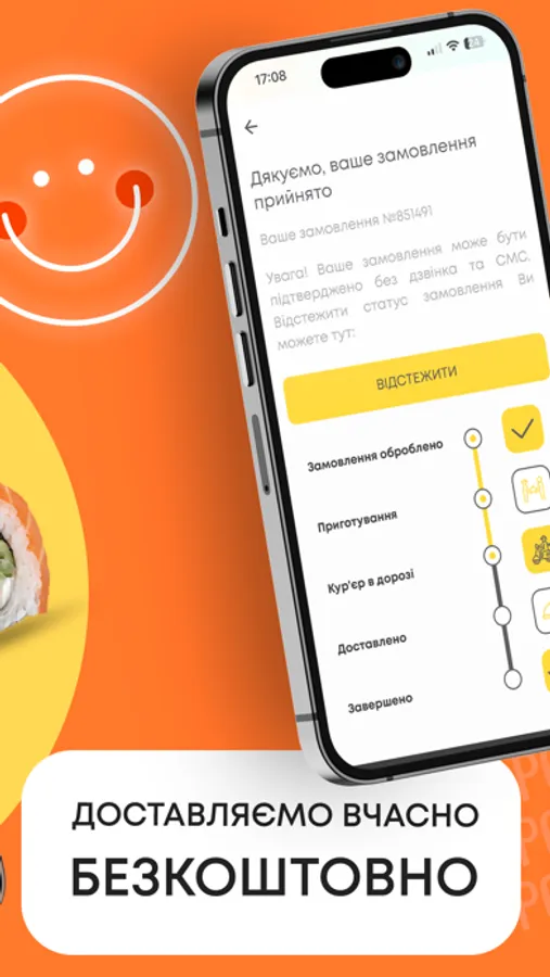 Ми цінуємо ваш час, тому пропонуємо можливість відстеження статус замовлення. Додаток показує статуси: замовлення оброблено, приготування, замовлення в дорозі, доставлено.