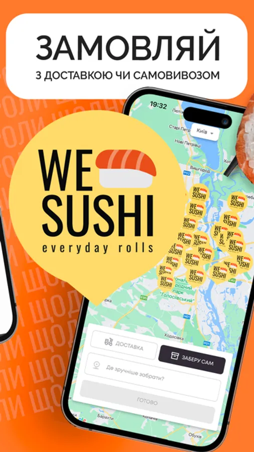 Замовте улюблену страву з доставкою лише в один клік або заберіть замовлення самостійно з функцією самовивізу у застосунку We Sushi.