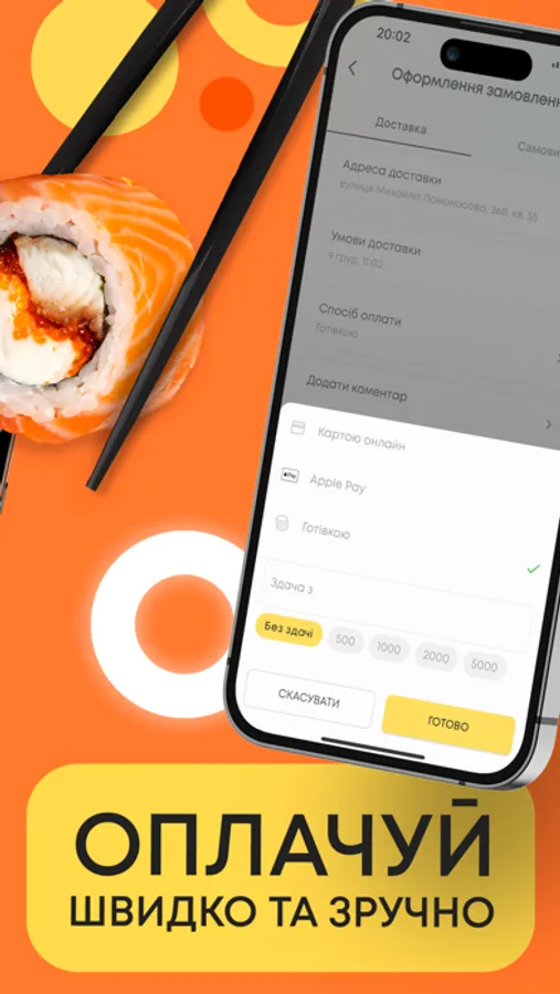 Варіанти оплати — готівка, оплата онлайн, картою кур'єру, Apple Pay, Google Pay.