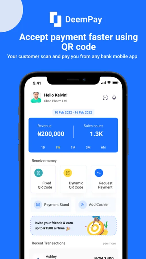 DeemPay is a payment App that enables you to accept in-store(physical store) or in-person payment faster, using QR Code and bank transfer from any mobile bank App in Nigeria. You can use it to accept payment in your shops, supermarket, and other businesses. You can use it to accept payment from your friends and you can use it to accept withdrawal from your customers for your POS business. Your customers or friends can just scan and pay you using any bank mobile app in Nigeria, or make bank transfer using USSD or mobile bank app.