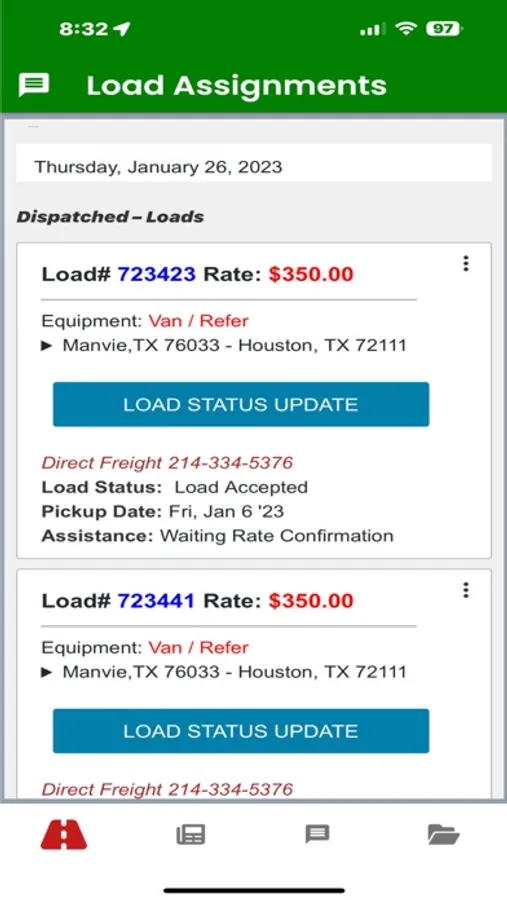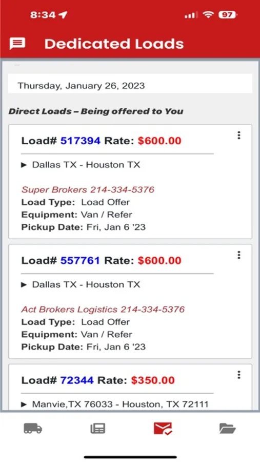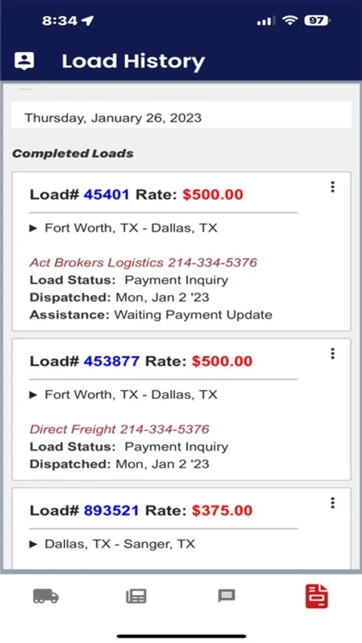 3. Load Assignments: Booked loads are located under the Load Assignments tab. Maintain solid relationships with brokers to keep accessing their loads via the app. Use in-app load status updates and notify the assigned broker about load issues or Lumper Fee requests, and more!