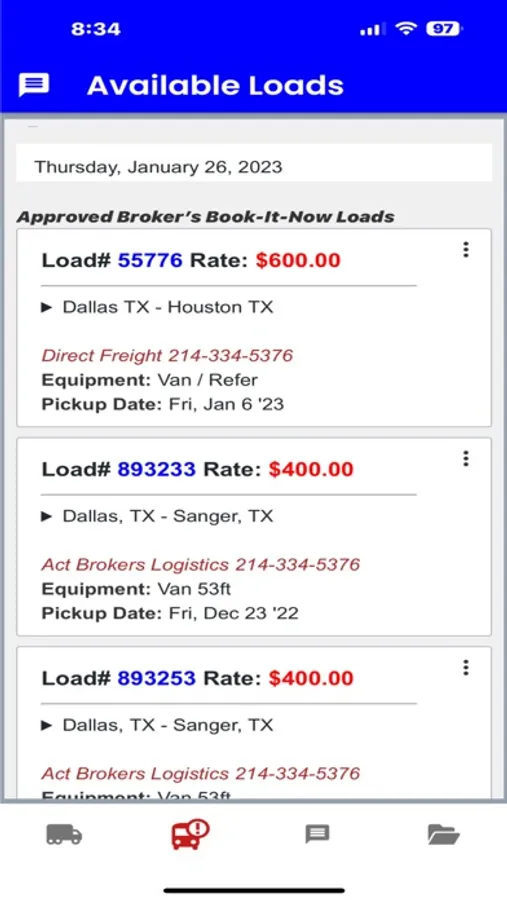 1. Available Loads: View and book available loads directly via the app. Simply hit the "BOOK LOAD - NOW" button, complete the process, and the load is yours. The broker will then send a Rate Confirmation electronically.
