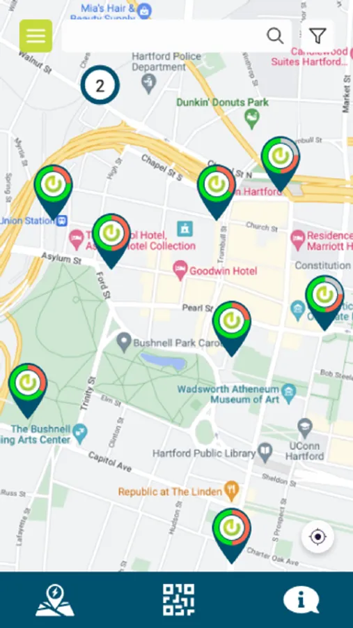 By selecting a location pin the user will be able to find all available chargers at a given location along with availability, a brief description, and a tariff summary.
