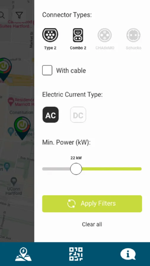Chargers can be filtered by connector types; electrical current type, min. Power available;