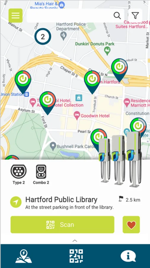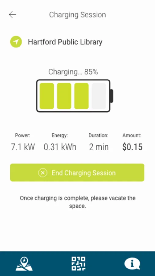 The user can scan a connector’s QR code at a given location and the app will automatically navigate to the “Start Session” page for the appropriate connector.