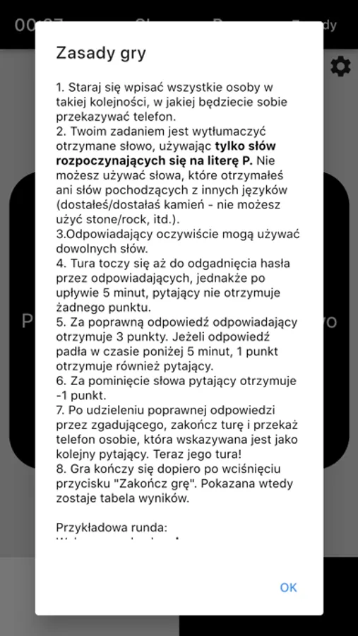 - Osoba, która zgadła hasło, otrzymuje 3 punkty. Jeżeli udało Ci się wytłumaczyć hasło w czasie poniżej 5 minut też otrzymujesz punkt!