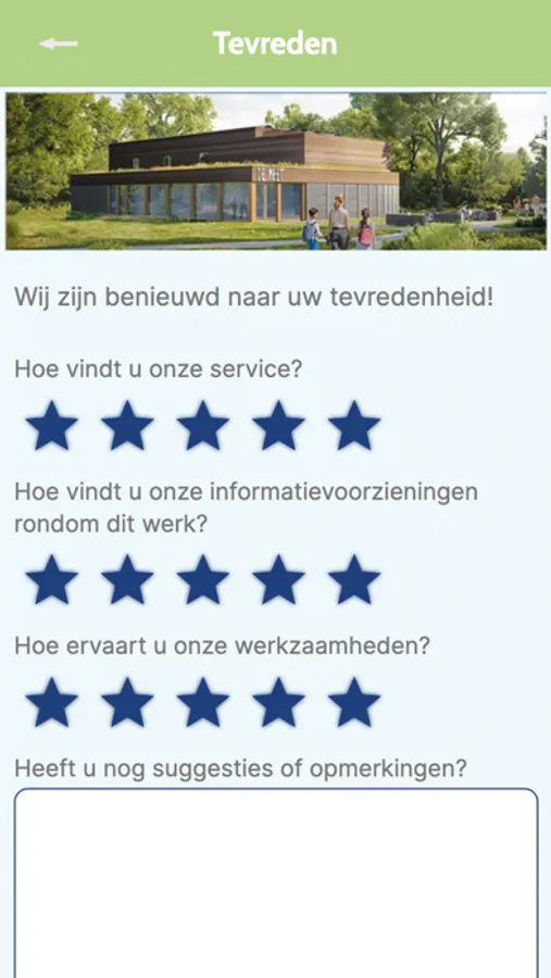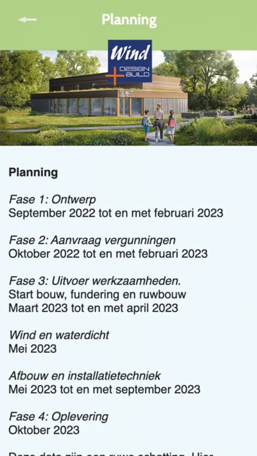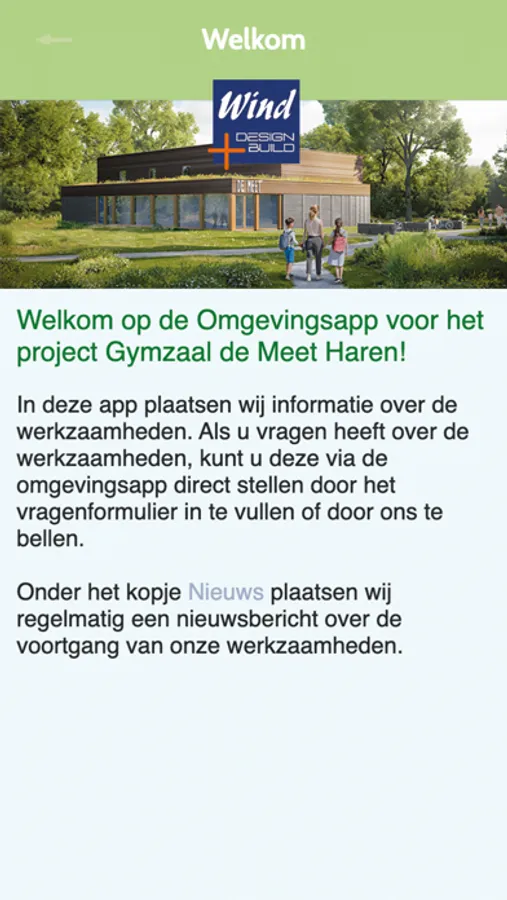In deze app vindt u alle informatie over de werkzaamheden van het project 'Gymzaal de Meet in Haren' door Wind Groep. Er wordt belangrijke projectinformatie, de laatste planning en contactinformatie weergegeven . Ook kunt u op deze app vragen, opmerkingen of klachten achterlaten die betrekking hebben op het project.
