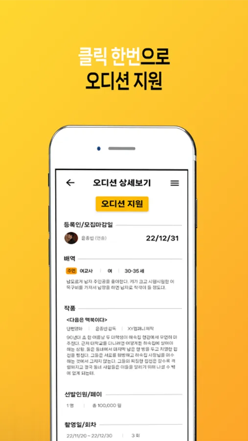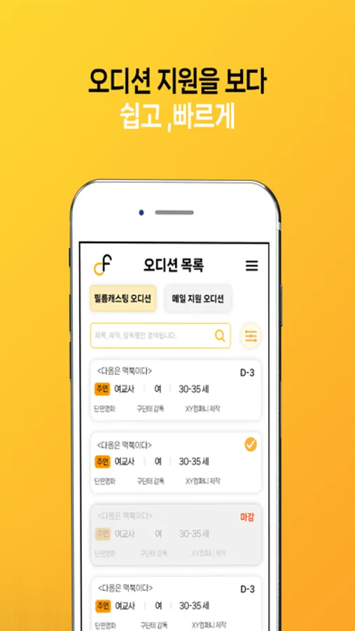 이전까지의 많은 플랫폼들이 상업영화, 드라마에만 집중을 했다고 한다면, 저희 필름 캐스팅은 상업영화, 드라마뿐만 아니라, 단편영화, 독립영화, 광고 등등 모든 영상 매체들을 다루고 있습니다. 저희 어플리케이션 그리고 웹사이트를 통해서, 여러분들의 꿈을 쉽고 빠르게 지원해보세요.