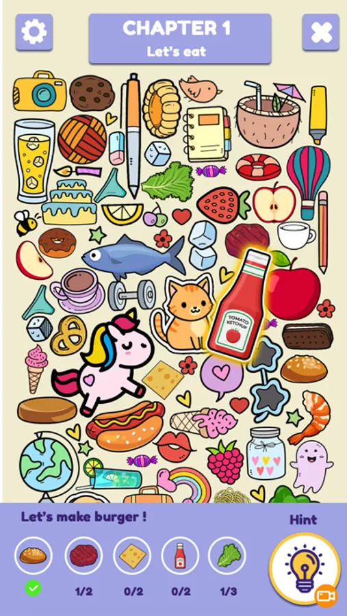 Find the correct objects among the others that make up a new item! Complete tasks to unlock new colorful levels.