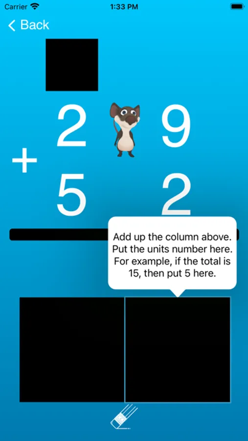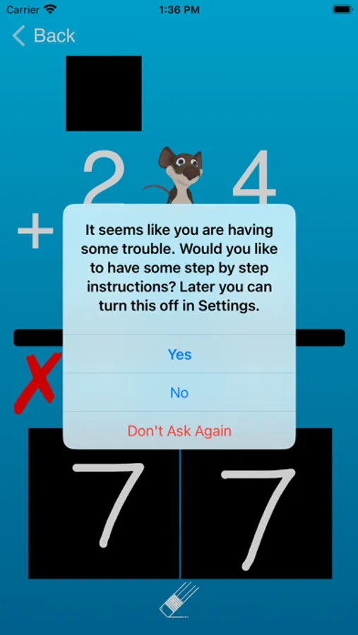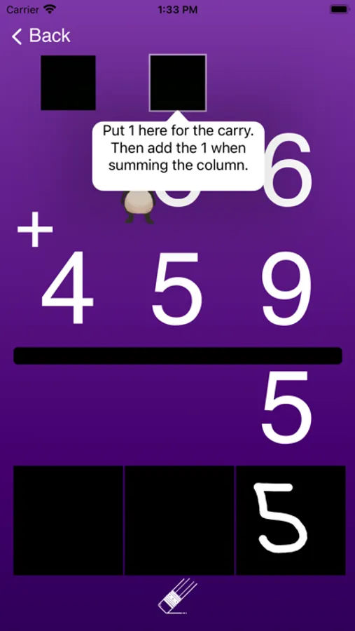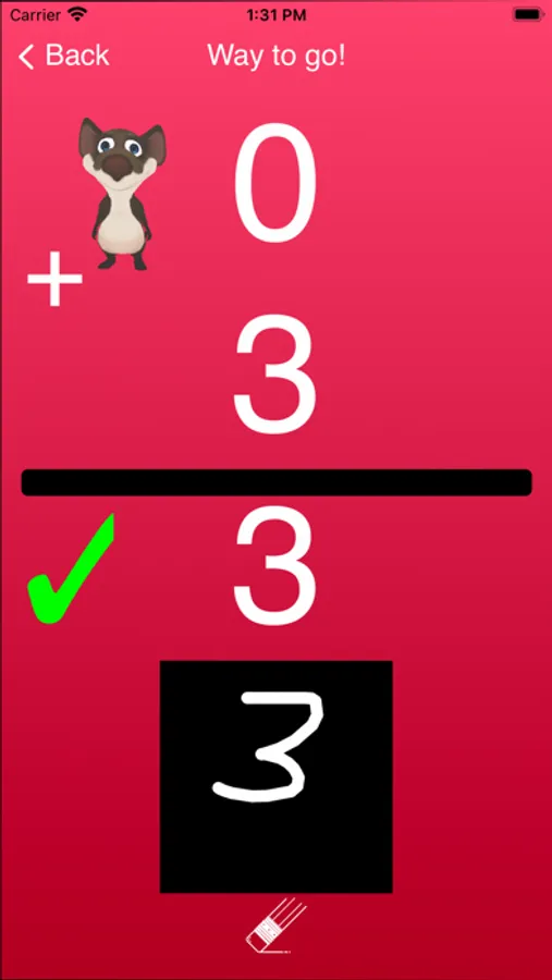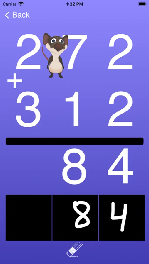 Students practice writing numbers too. AI converts the student's handwritten numbers into digits. Single-digit addition is free. Multi-digit addition with carrying along with custom colors, specific numbers to learn, different character voices, and background music requires an in-app purchase.