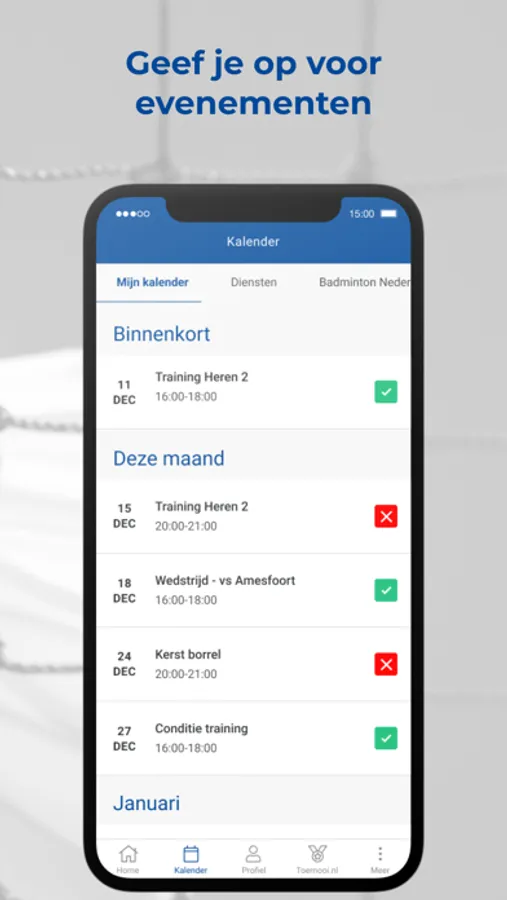 - Geef jouw aanwezigheid door voor wedstrijden, trainingen en evenementen