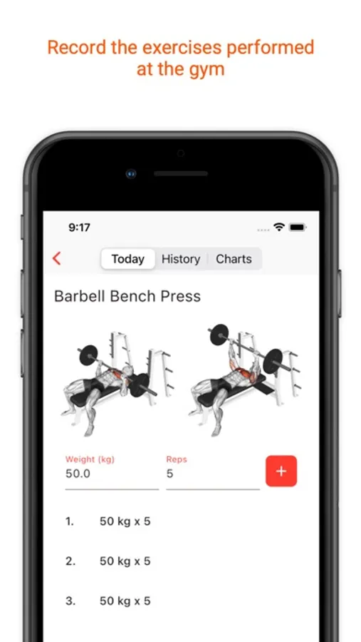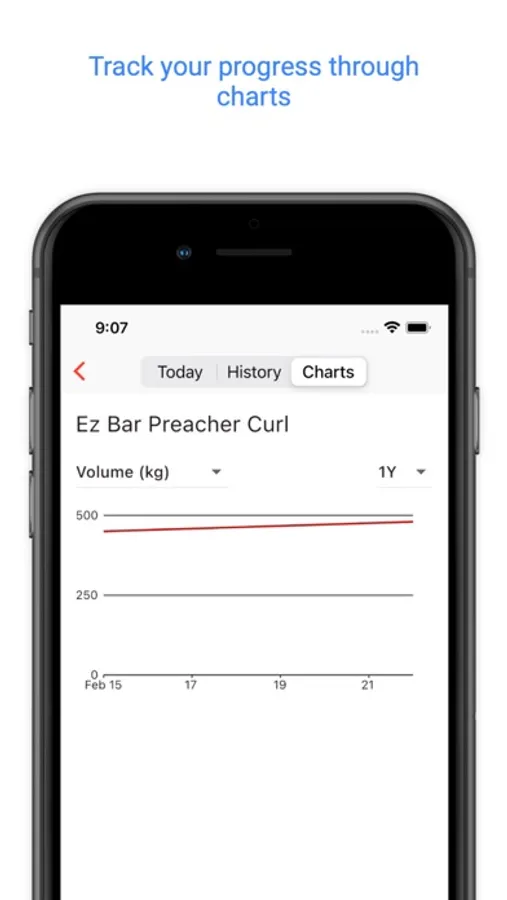• Charts: View your progress through charts of maximum weight and volume for each exercise.