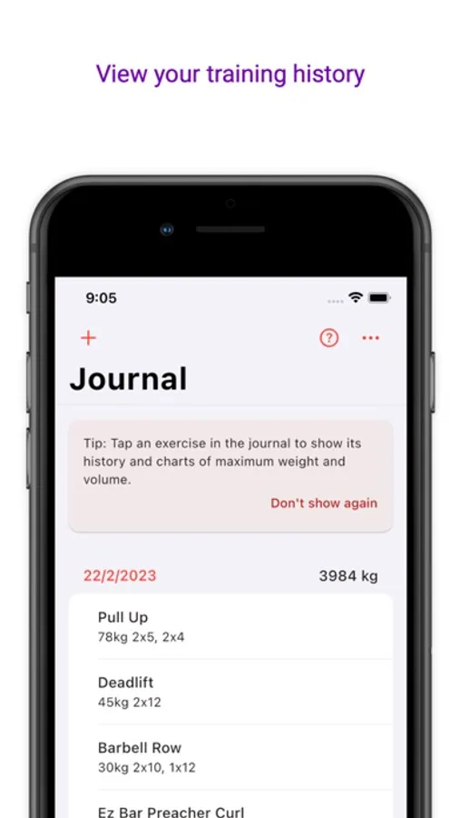 Tapping an exercise in the journal you can access its history and charts of maximum weight and volume.