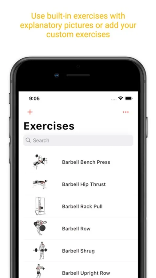 • Exercises: Use the list of built-in exercises with explanatory pictures or add your custom exercises.