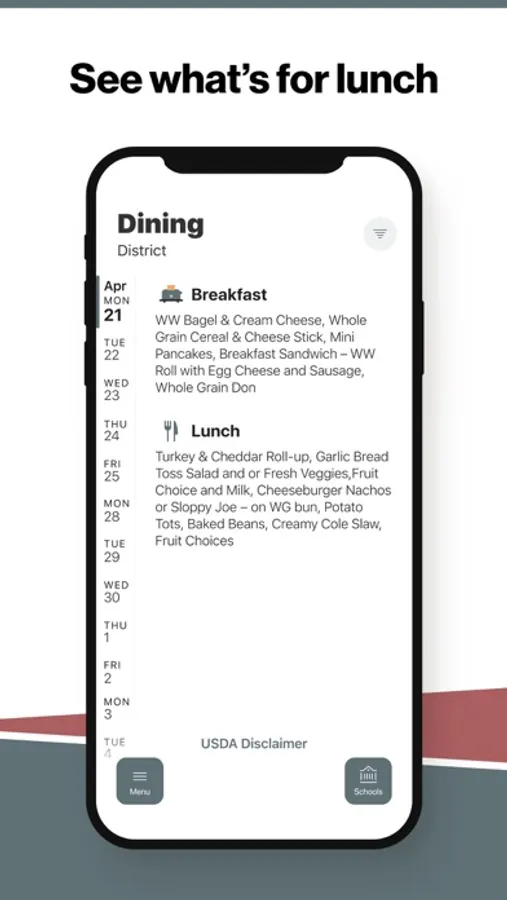 Within the dining section, you'll find an easy to navigate, weekly menu, sorted by day and meal type.