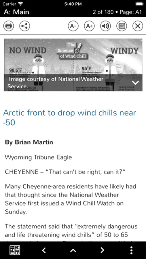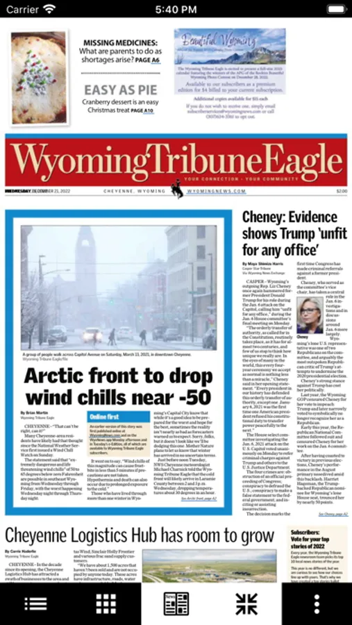 This is a digital replica of The Wyoming Tribune Eagle. Here you will find local, state, national and world news. The Wyoming Tribune Eagle founded in 1867 is a daily newspaper published in Cheyenne and distributed primarily in Laramie County, Wyoming. It is the state's second largest newspaper in terms of circulation, behind the Casper Star Tribune. The Tribune Eagle is also one of several newspapers serving the Front Range Urban Corridor. The Wyoming Tribune Eagle is owned by Adams Publishing Group.