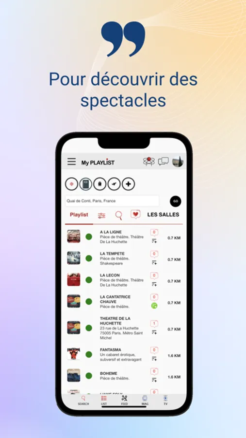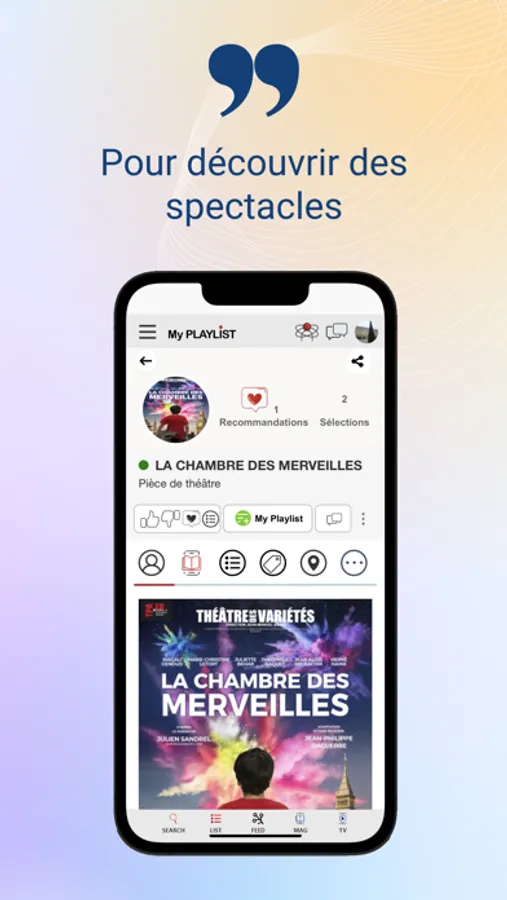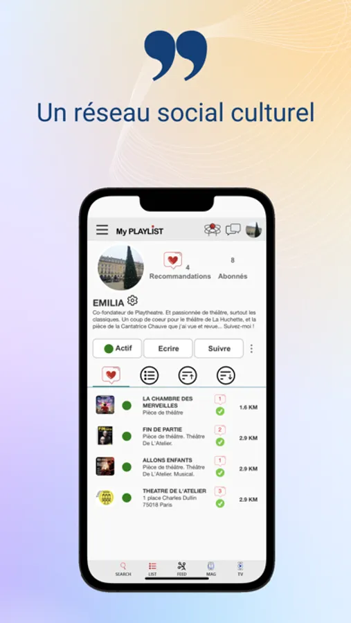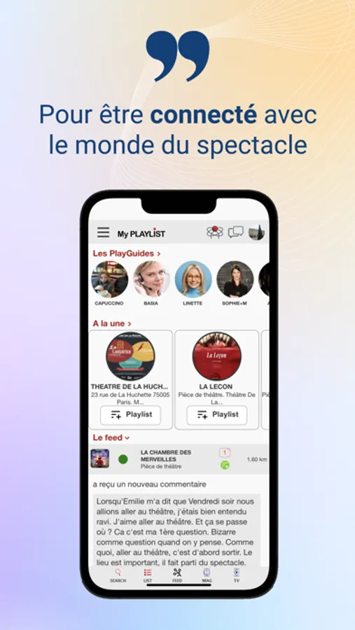 PlayThéâtre est un RESEAU SOCIAL CULTUREL qui rassemble tous les amoureux du théâtre. Pour être connecté avec le monde du théâtre, pour donner son avis sur les pièces, pour guider les autres membres et bien sûr pour découvrir des nouveaux spectacles, etc.