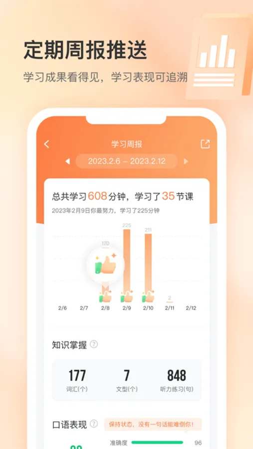 【定期报告,监控学情】定期推送短期周报及长期级别报告,帮助您实时掌控自身学情,查漏补缺,温故知新。